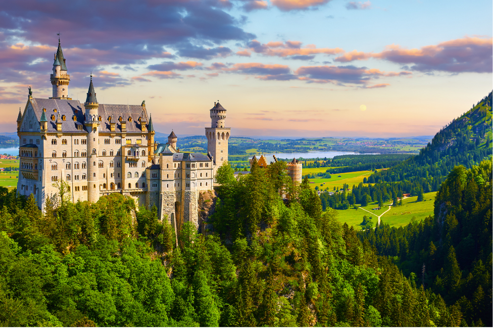 - Lâu đài Neuschwanstein: Tọa lạc trên một ngọn đồi với khung cảnh núi rừng bao quanh, lâu đài này được xem là nguồn cảm hứng cho lâu đài trong phim hoạt hình của Disney.